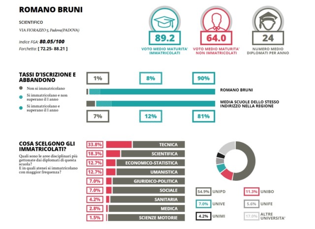In questo caso, a emergere nel nostro territorio è il liceo Romano Bruni di Padova: il suo indirizzo scientifico, infatti, è quello col più alto tasso di studenti che, una volta iscritti alla scuola, raggiungono il termine degli studi arrivando al diploma.