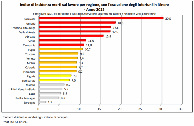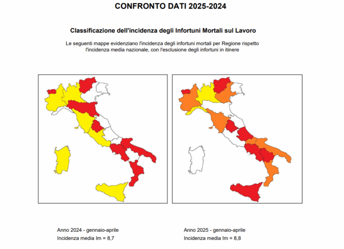 A finire in zona rossa ad aprile 2025 con un’incidenza superiore a +25% rispetto alla media nazionale (Im=Indice incidenza medio, pari a 8,8 morti sul lavoro ogni milione di lavoratori) sono: Basilicata, Umbria, Trentino-Alto Adige, Valle d’Aosta, Abruzzo, Sicilia e Campania. In zona arancione: Puglia, Toscana, Veneto, Molise, Piemonte e Calabria. In zona gialla: Liguria e Lombardia. In zona bianca: Marche, Friuli-Venezia Giulia, Lazio, Emilia-Romagna e Sardegna.