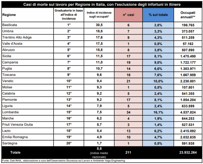 Alla Lombardia va la maglia nera per il maggior numero di vittime in occasione di lavoro (34). Seguono: Veneto (21), Campania (19), Piemonte e Sicilia (17), Toscana (16), Puglia (14), Lazio (13), Emilia-Romagna (10), Trentino-Alto Adige (9), Abruzzo (8), Umbria (7), Basilicata (6), Liguria e Calabria (5), Marche (4), Friuli-Venezia Giulia (3), Sardegna, Molise e Valle D’Aosta (1).