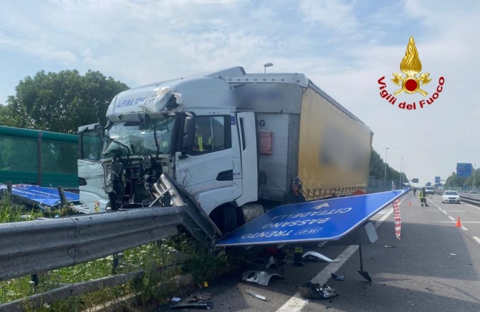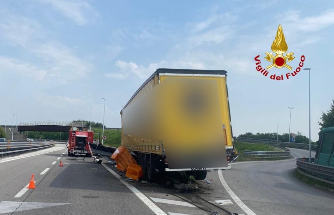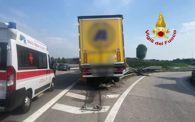 I vigili del fuoco sono intervenuti a Limena lungo la SP 47 in direzione Cittadella allo svincolo Vaccarino per un autoarticolato finito contro la cuspide del guardrail.