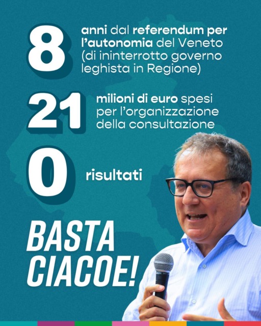 “Il 22 ottobre 2017, esattamente 8 anni fa, si è celebrato il referendum per l’autonomia del Veneto. La consultazione, voluta dalla Regione, è costata ai contribuenti oltre 21 milioni di euro. Per oltre il 50% di questi otto anni la Lega è stata al Governo nazionale. In particolare modo negli ultimi tre, con il governo Meloni, il candidato Alberto Stefani è stato Presidente della commissione parlamentare per l’attuazione del federalismo fiscale.
