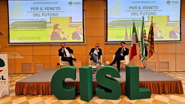 In più di cinquecento delegati e delegati di Cisl Veneto, riuniti in assemblea mercoledì mattina, 22 ottobre 2025, all’hotel Crowne Plaza di Padova, hanno incontrato i candidati alla presidenza della Regione del Veneto dei due maggiori schieramenti politici, Giovanni Manildo per il centrosinistra e Alberto Stefani per il centrodestra.