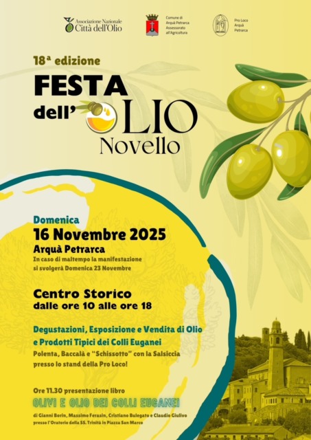 La festa inizierà per le 10 e durerà fino alle 18, con anche delle dimostrazioni degli antichi mestieri e la presentazione del libro: Olivi e Olio dei Colli Euganei, scritto da Gianni Morin, Cristiano Bulegato, Massimo Ferasin e Claudio Giulivo.