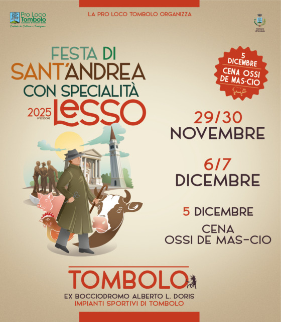 “In occasione della festa del patrono Sant’Andrea, Tombolo celebra le sue radici e la storica vocazione di commercianti e mediatori di bestiame con il piatto simbolo di questa terra: il LESSO!”.