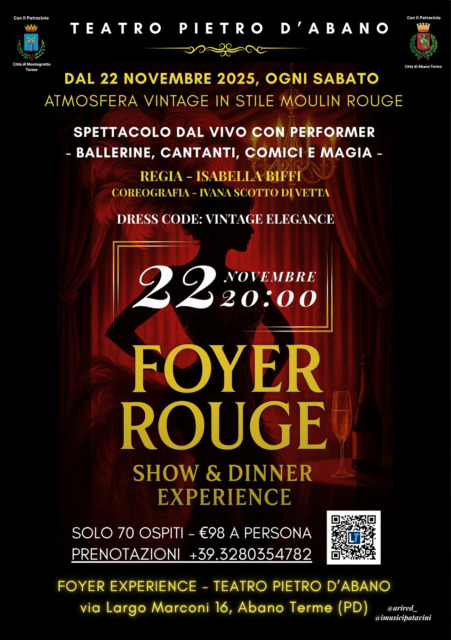 Sabato 22 novembre 2025, il Teatro presenterà Foyer Rouge, una serata a tema Moulin Rouge. In particolare, il foyer si trasformerà e tornerà indietro nel tempo con un’ambientazione tipica della Belle Epoque: luci soffuse, piume e costumi scintillanti, velluti rossi e scenografie vintage.